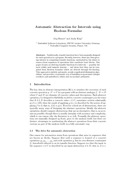 Traditionally, transfer functions have been manually designed for each operation in a program. Recently, however, there has been growing interest in computing transfer functions, motivated by the desire to reason about sequences of operations that constitute basic blocks. This paper focuses on deriving transfer functions for intervals | possibly the most widely used numeric domain | and shows how they can be computed from Boolean formulae which are derived through bit-blasting. This approach is entirely automatic, avoids complicated elimination algorithms, and provides a systematic way of handling wrap-arounds (integer overflows and underflows) which arise in machine arithmetic.