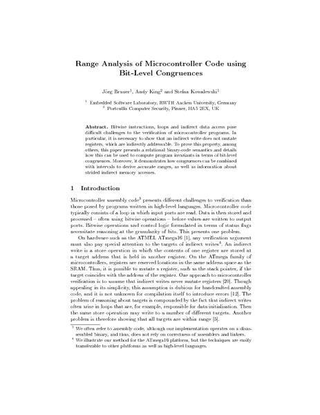 Bitwise instructions, loops and indirect data access pose difficult challenges to the verification of microcontroller programs. In particular, it is necessary to show that an indirect write does not mutate registers, which are indirectly addressable. To prove this property, among others, this paper presents a relational binary-code semantics and details how this can be used to compute program invariants in terms of bit-level congruences. Moreover, it demonstrates how congruences can be combined with intervals to derive accurate ranges, as well as information about strided indirect memory accesses.