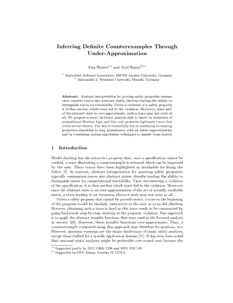 Abstract interpretation for proving safety properties summarizes concrete traces into abstract states, thereby trading the ability to distinguish traces for tractability. Given a violation of a safety property, it is thus unclear which trace led to the violation. Moreover, since part of the abstract state is over-approximate, such a trace may not exist at all. We propose a novel backward analysis that is based on abduction of propositional Boolean logic and that only generates legitimate traces that reveal actual defects. The key to tractability lies in modifying an existing projection algorithm to stop prematurely with an under-approximation and by combining various algorithmic techniques to handle loops finitely. 1 Introduction Model checking has the attractive property that, once a specification cannot be verified, a trace illustrating a counterexample is returned which can be inspected by the user. These traces have been highlighted as invaluable for fixing the defect [9]. In contrast, abstract interpretation for asserting safety properties typically summarizes traces into abstract states, thereby trading the ability to distinguish traces for computational tractability. Upon encountering a violation of the specification, it is then unclear which trace led to the violation. Moreover, since the abstract state is an over-approximation of the set of actually reachable states, a trace leading to an erroneous abstract state may not exist at all. Given a safety property that cannot be proved correct, a trace to the beginning of the program would be similarly instructive to the user as in model checking. However, obtaining such a trace is hard as this trace needs to be constructed by going backwards step-by-step, starting at the property violation. One approach is to apply the abstract transfer functions that were used in the forward analysis in reverse [28]. However, these transfer functions over-approximate. Thus, a counterexample computed using this approach may therefore be spurious, too. However, spurious warnings are the major hinderance of many static analyses, except those crafted for a specific application domain [11]. It has even been noted that unsound static analyses might be preferable over sound ones because the