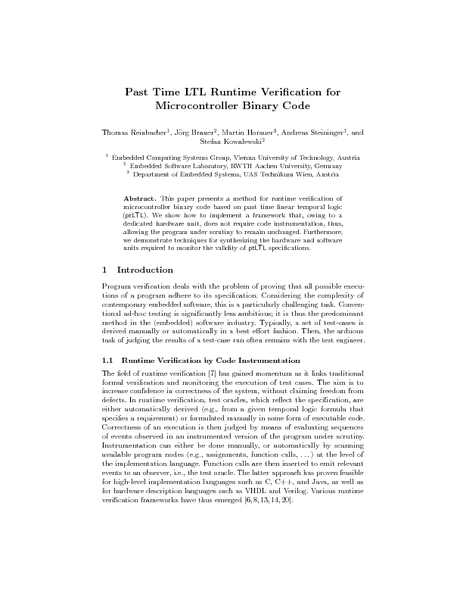 This paper presents a method for runtime verification of microcontroller binary code based on past time linear temporal logic ( ptLTL ). We show how to implement a framework that, owing to a dedicated hardware unit, does not require code instrumentation, thus, allowing the program under scrutiny to remain unchanged. Furthermore, we demonstrate techniques for synthesizing the hardware and software units required to monitor the validity ofptLTLspecifications.