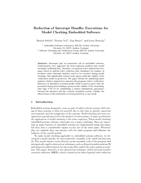 Interrupts play an important role in embedded software. Unfortunately, they aggravate the state-explosion problem that model checking is suffering from. Therefore, we propose a new abstraction technique based on partial order reduction that minimizes the number of locations where interrupt handlers need to be executed during model checking. This significantly reduces state spaces while the validity of the verification results is preserved. The paper details the underlying static analysis which is employed to annotate the programs before verification. Moreover, it introduces a formal model which is used to prove that the presented abstraction technique preserves the validity of the branchingtime logic CTL*-X by establishing a stutter bisimulation equivalence between the abstract and the concrete transition system. Finally, the effectiveness of this abstraction is demonstrated in a case study.