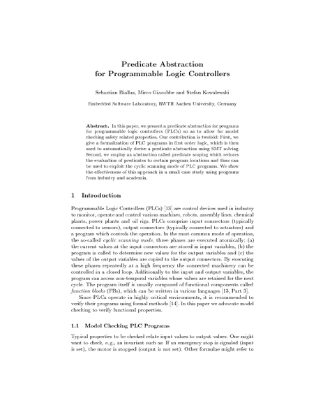 In this paper, we present a predicate abstraction for programs for programmable logic controllers (PLCs) so as to allow for model checking safety related properties. Our contribution is twofold: First, we give a formalization of PLC programs in first order logic, which is then used to automatically derive a predicate abstraction using SMT solving. Second, we employ an abstraction called predicate scoping which reduces the evaluation of predicates to certain program locations and thus can be used to exploit the cyclic scanning mode of PLC programs. We show the effectiveness of this approach in a small case study using programs from industry and academia.