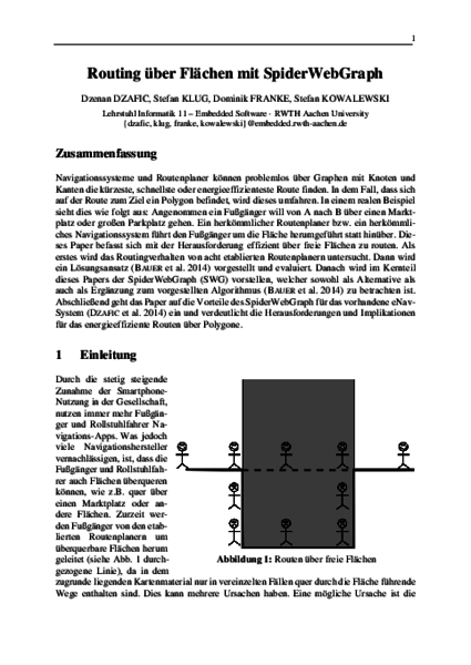 Navigationssysteme und Routenplaner können problemlos über Graphen mit Knoten und Kanten die kürzeste, schnellste oder energieeffizienteste Route finden. In dem Fall, dass sich auf der Route zum Ziel ein Polygon befindet, wird dieses umfahren. In einem realen Beispiel sieht dies wie folgt aus: Angenommen ein Fußgänger will von A nach B über einen Markt-platz oder großen Parkplatz gehen. Ein herkömmlicher Routenplaner bzw. ein herkömmli-ches Navigationssystem führt den Fußgänger um die Fläche herumgeführt statt hinüber. Die-ses Paper befasst sich mit der Herausforderung effizient über freie Flächen zu routen. Als erstes wird das Routingverhalten von acht etablierten Routenplanern untersucht. Dann wird ein Lösungsansatz (BAUER et al. 2014) vorgestellt und evaluiert. Danach wird im Kernteil dieses Papers der SpiderWebGraph (SWG) vorstellen, welcher sowohl als Alternative als auch als Ergänzung zum vorgestellten Algorithmus (BAUER et al. 2014) zu betrachten ist. Abschließend geht das Paper auf die Vorteile des SpiderWebGraph für das vorhandene eNav-System (DZAFIC et al. 2014) ein und verdeutlicht die Herausforderungen und Implikationen für das energieeffiziente Routen über Polygone.